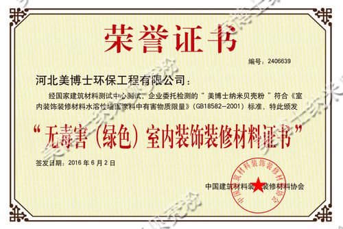 美博士經(jīng)國(guó)家建筑材料測(cè)試中心,企業(yè)委托檢測(cè)的“美博士納米貝殼粉”符合《室內(nèi)裝飾裝修材料水溶性墻面涂料中有害物質(zhì)限量》(GB18582-2001)標(biāo)準(zhǔn),中國(guó)建筑材料裝飾裝修材料協(xié)會(huì)于2016年6月2日特此頒發(fā)了“無毒害(綠色)室內(nèi)裝飾裝修材料證書”